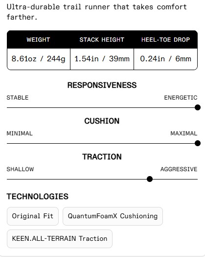 Bring on those HKTs (happiest known times) with our ultra-durable trail running shoe. Iconic KEEN fit, energetic cushioning, and proven durability and protection, now in a light, rugged trail runner. Original Fit KEEN.ALL-TERRAIN Eco Anti-Odor Reflective