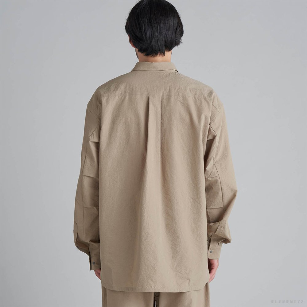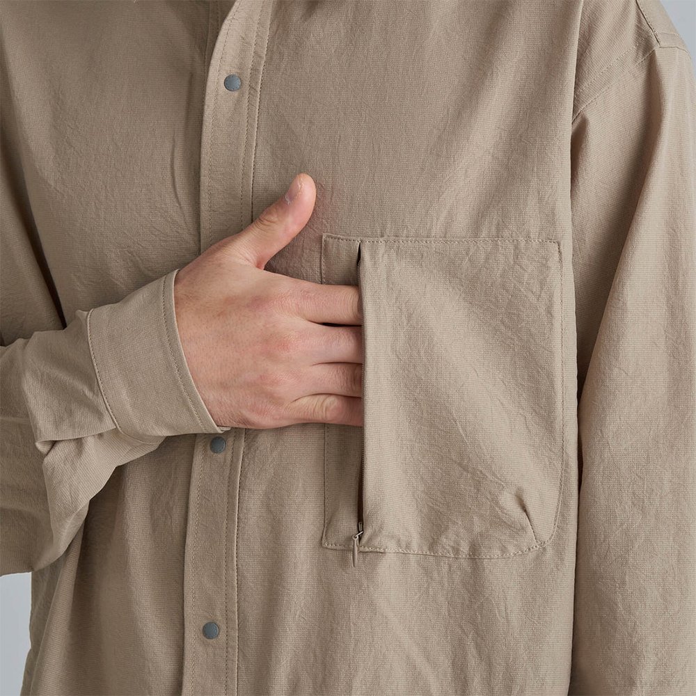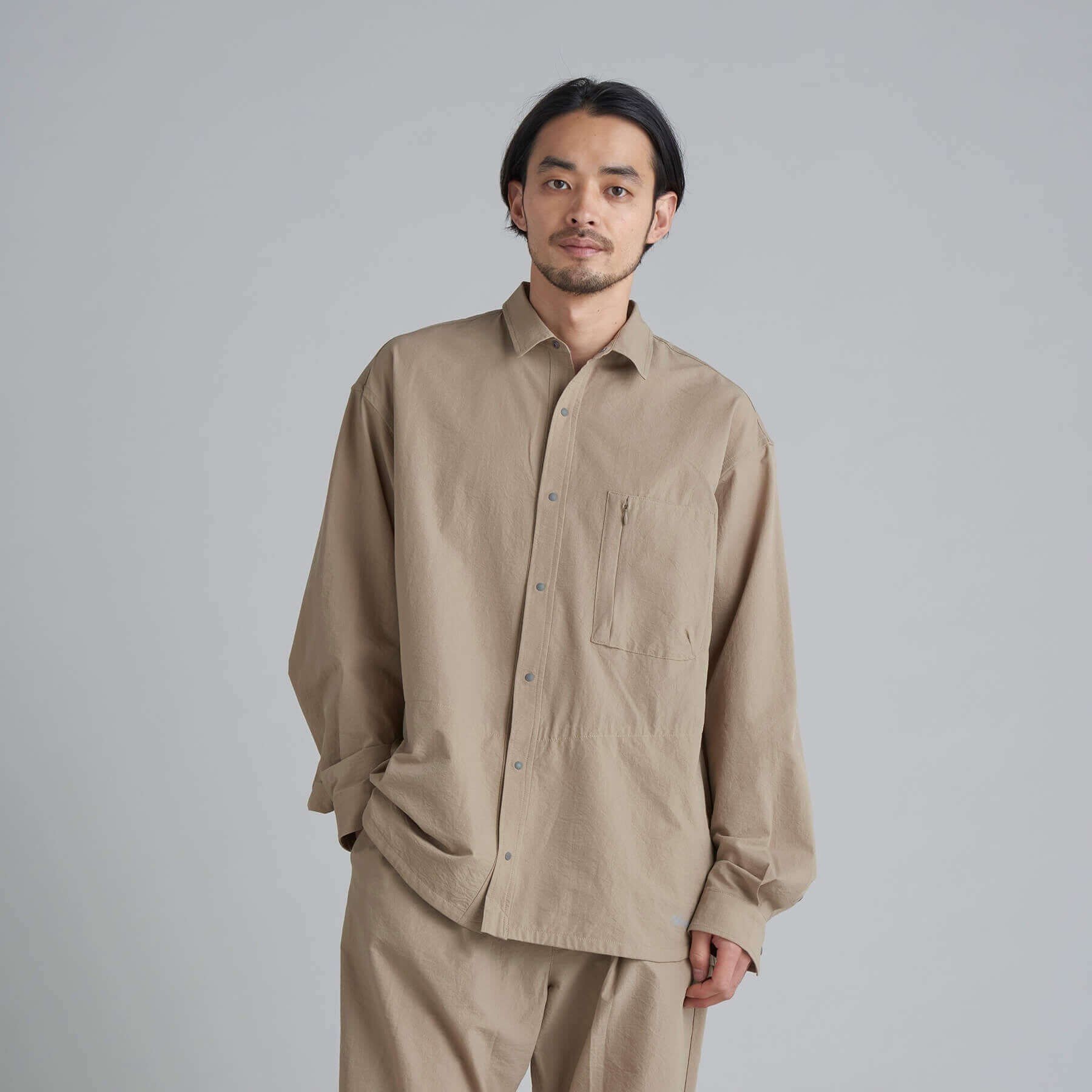 A comfortable and smart regular collar long sleeve shirt Uses lightweight "DotAir®" material with excellent breathability, sweat absorption, and quick drying properties The compact collar and relaxed silhouette create a smart design. Equipped with seam pockets on both sides and a three-dimensional gusseted pocket on the chest Comfortable to wear and dries quickly even when wet with sweat or water Wrinkle-resistant, making it convenient for travel and business trips